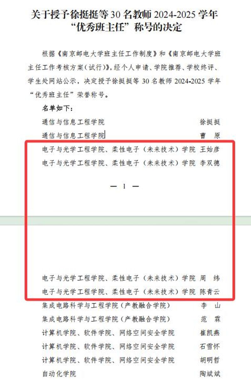近日,南京郵電大學(xué)2024-2025學(xué)年“優(yōu)秀班主任”評(píng)選結(jié)果正式揭曉。全校共30位教師獲此殊榮,其中,電子與光學(xué)工程學(xué)院、柔性電子(未來技術(shù))學(xué)院共有四位教師光榮入選,分別是王始彥、李雙德、周緯、陳青云。本次評(píng)選注重學(xué)生的真實(shí)反饋,根據(jù)“學(xué)生評(píng)價(jià)情況”(即班主任工作測(cè)評(píng)分?jǐn)?shù))和班主任提交的各類履職材料,對(duì)各位班主任老師的履職情況進(jìn)行綜合評(píng)定,最終擇優(yōu)入選。電光柔院此次能夠有四位教師脫穎而出,榮獲校級(jí)“優(yōu)秀班主任”稱號(hào),是學(xué)校對(duì)學(xué)院班主任工作整體水平和育人實(shí)效的高度認(rèn)可。入選老師在日常工作中,始終堅(jiān)守育人初心,恪盡職守,在思想引領(lǐng)、學(xué)業(yè)指導(dǎo)、生涯規(guī)劃、班級(jí)管理等方面傾注了大量心力,贏得了學(xué)生一致好評(píng)。此次優(yōu)異成績的取得是學(xué)院長期以來堅(jiān)持立德樹人根本任務(wù)、不斷加強(qiáng)和改進(jìn)班主任工作的成果體現(xiàn)。電光柔院將以此為契機(jī),持續(xù)深化班主任隊(duì)伍建設(shè),充分發(fā)揮優(yōu)秀班主任的示范引領(lǐng)作用,不斷探索學(xué)生工作的新思路、新方法,努力提升人才培養(yǎng)質(zhì)量,為學(xué)生的全面成長成才和學(xué)校的高質(zhì)量發(fā)展做出更大貢獻(xiàn)。撰稿:祝騰審核:徐磊編輯:祝騰